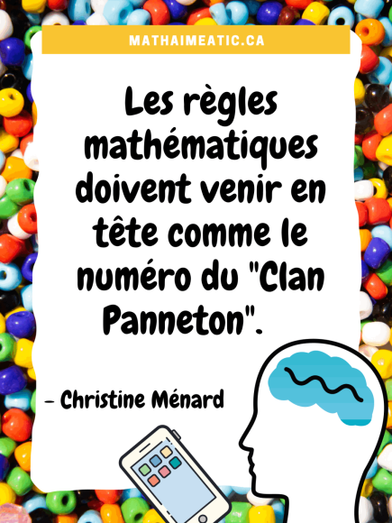 Dès le début des apprentissages, ayez des exigences claires. Pas "élevées", "claires". Si vous demandez le calme, exigez le calme. Si vous demandez le silence, exigez le silence et ne vous contentez pas du calme. Lors d'apprentissages mathématiques, répétez les règles. Les règles mathématiques doivent venir en tête comme le numéro du "Clan Panneton". Lorsqu'elles sont connues, l'enfant doit les appliquer dans les bons contextes. Posez-lui des questions: "Que connais-tu des chaînes d'opérations?" ou "Qu'est-il important de se rappeler lors d'additions de fractions?"