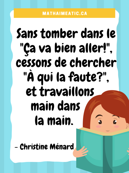 Dans le milieu scolaire, ce n'est pas différent! On entend régulièrement: "C'est évident, tu-sais-qui était son enseignant l'an dernier..." ou "Il ne faut pas compter sur ce parent...". C'est très facile de mettre le blâme sur les autres. Si nous nous disions, parents, enseignants, T.E.S., secrétaire, directions et autres: "Qu'est-ce que, MOI, je peux faire de différent?".